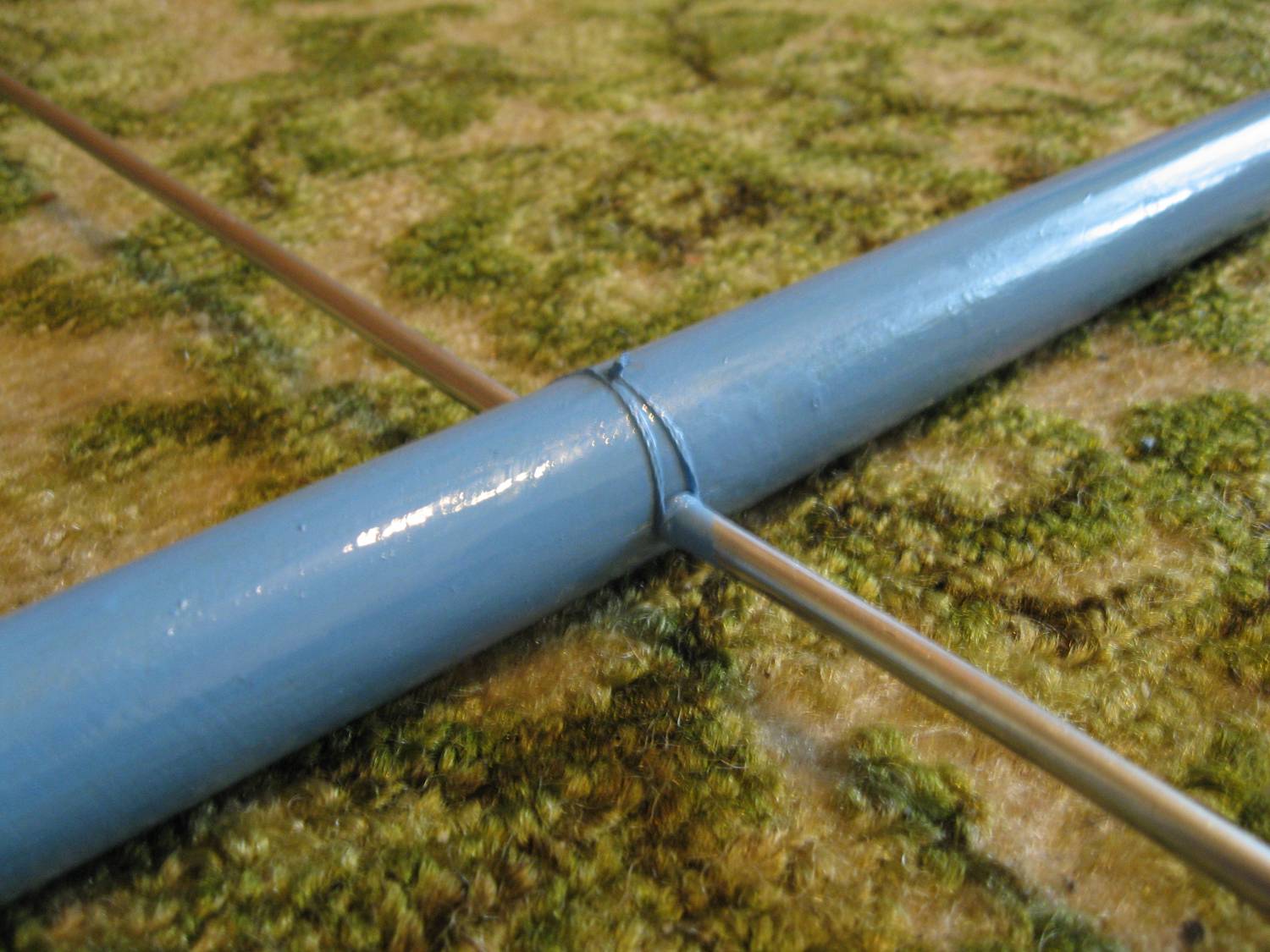 При изготовлении элементов для первой такой антенны на всякий случай оставлял по 0,5 мм добавки по длине, но, как показало испытание антенны, это излишнее. Можно резать элементы точно в размер, как в модели антенны. Далее стыкуем трубы между собой, либо при помощи отрезка трубы меньшего диаметра, либо трубу меньшего диаметра внутрь трубы большего диаметра. Второй вариант стыковки надежнее, поэтому если длина антенны большая и последняя строится для стационарного использования - лучше применять его.