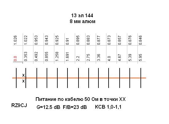 Сергей здравствуйте хочу повторить антенну 13 ел 8мм 50 ом на 144мгц